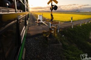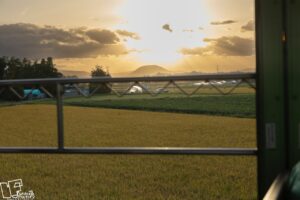 車窓に広がる収穫前の稲と大豆。そしてすぐ近くに栽培されていたネギ。何が言いたいかというと、この一画だけで納豆ご飯にネギのみそ汁に冷ややっこが作れてしまうのだよ(笑)